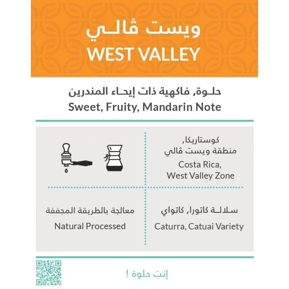 يأتي محصول ويست ڤالي من مزارع كوستاريكا وتمت زراعة البن على ارتفاع 1300 - 1400 متر فوق سطح البحر ومعالج بالطريقة المجففة.