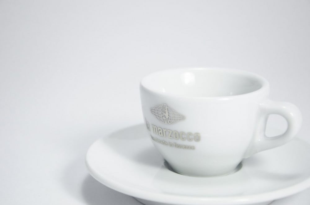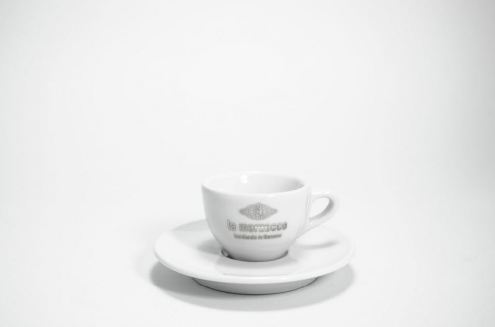 فنجان اسبريسو من La Marzocco أبيض عليه شعار لامرزوكو بلاتينيوم .
